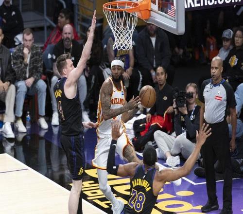 中场休息归来,詹姆斯内外线火力全开,引领湖人率先打出14-3的攻势,将比分迅速拉开至95-63,建立起32分的巨大领先优势。不过老鹰并未放弃,杰伦命中三分,麦科勒姆随后上篮+三分连得5分,引领球队打出一波13-0的反击潮,将分差缩小至17分。危急时刻,拉拉维亚抛射命中打破湖人得分荒。比赛中途,詹姆斯出现一瘸一拐的状况,好在并无大碍,短暂调整后继续征战。后续老鹰持续发力缩小分差,三节战罢,湖人以102-86仍保有16分的领先优势。